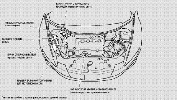 Расположение заправочных горловин и контрольных щупов (для версий с дизельными двигателями)